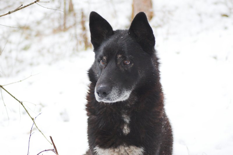 Пес матерый. Когда то носил ошейник, след которого угадывается на шее. Кочегар Валерий, у которого мы останавливались в котельной, говорил, что у Тринадцатого есть хозяева. В целом же пес производит впечатление существа полудикого. И глаза холодные злые, когда он бегает, выискивая добычу. А на стоянках порой взгляд был печальный, в котором была видна вся его нелегкая полудикая жизнь.